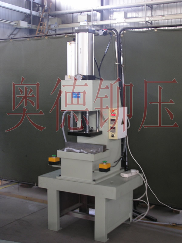 在工作狀態(tài)下,操作人員將零件放入定位模具中,按下雙手按鈕啟動設(shè)備,氣液增力缸快進(jìn)行程工作,上?焖傩×Φ轿唤佑|工作,無沖擊,無噪音,上模具接觸工件,氣液增力缸自動轉(zhuǎn)換為力行程,增力行程開始工作對產(chǎn)品裝配,產(chǎn)品裝配后,則油壓繼電器動作,控制上模返程.系統(tǒng)維護(hù)裝置(氣源處理器三聯(lián)件)對輸入的干燥壓縮空氣再次進(jìn)行水分分離、油霧化,并對輸入氣壓進(jìn)行無級可調(diào),從而實現(xiàn)沖壓力在規(guī)定的范圍內(nèi)無級別可調(diào)。